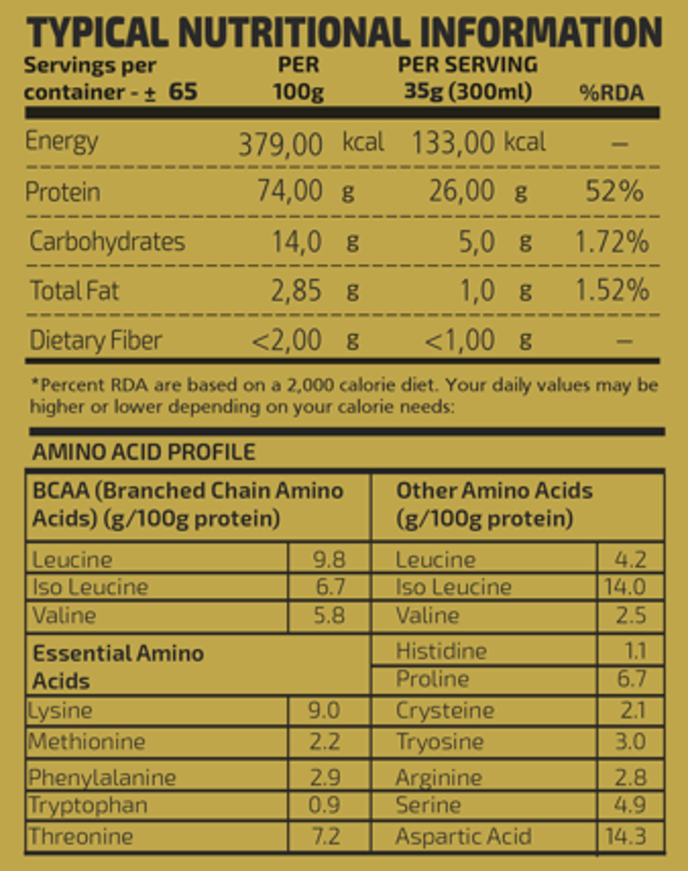 Mix 1 scoop (35g) with 300–400 ml of cold water, milk, or your preferred beverage. Consume after workout or anytime during the day to meet your daily protein intake.